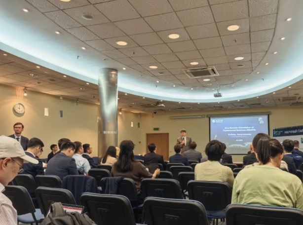 教育合作與交流是本次調(diào)研行程的重要組成部分,7月20日至21日調(diào)研團(tuán)全體成員在莫斯科國立大學(xué)參加了第二屆中俄基礎(chǔ)科學(xué)論壇。論壇聚焦材料科學(xué)與化學(xué)領(lǐng)域等前沿課題,匯聚來自兩國多所頂尖機(jī)構(gòu)的100余位學(xué)者參與,共舉行30余場學(xué)術(shù)報(bào)告及相關(guān)專題研討。彭海琳院長帶領(lǐng)的化學(xué)學(xué)科領(lǐng)域?qū)W術(shù)團(tuán)隊(duì)圍繞二維材料界面調(diào)控、密度泛函近似的系統(tǒng)性優(yōu)化、多肽合成與生物學(xué)應(yīng)用、化學(xué)系統(tǒng)的液相電子顯微成像等主題作了學(xué)術(shù)報(bào)告,全面展示了從理論研究到實(shí)驗(yàn)驗(yàn)證再到實(shí)際應(yīng)用的科研進(jìn)展。鄒如強(qiáng)院長帶領(lǐng)的材料學(xué)科領(lǐng)域?qū)W術(shù)團(tuán)隊(duì),則聚焦AI賦能材料篩選與應(yīng)用、先進(jìn)儲(chǔ)能材料及先進(jìn)光伏材料等領(lǐng)域作專題報(bào)告,系統(tǒng)闡述了材料學(xué)科在前沿科學(xué)研究中的發(fā)展脈絡(luò)與未來方向。