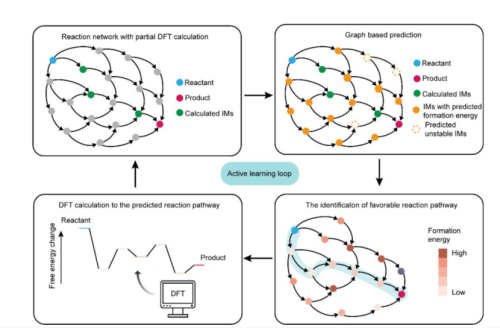 潘鋒團隊引入了一種結(jié)合圖論和AI主動學習循環(huán)的工作流程,以解決復(fù)雜表面電催化反應(yīng)路徑預(yù)測這一長期存在的挑戰(zhàn)。通過圖論方法,以尿素電化學催化合成為例,遍歷了其催化合成反應(yīng)中大多數(shù)鍵重排類型及相應(yīng)的重構(gòu)模式,通過AI機器學習方法對反應(yīng)網(wǎng)絡(luò)中間體穩(wěn)定性和形成能進行預(yù)測,降低了密度泛函理論的計算成本。以在氮摻雜石墨烯作為催化劑為例,該圖論結(jié)構(gòu)電化學理論在尿素電催化合成這一反應(yīng)中得到驗證,說明該理論框架的有效性。該反應(yīng)體系在工作條件下發(fā)生顯著動態(tài)結(jié)構(gòu)重構(gòu)。整個反應(yīng)網(wǎng)絡(luò)包含901個反應(yīng)物種,利用該框架,只需計算其中的40%就可實現(xiàn)對反應(yīng)網(wǎng)絡(luò)能量學的評估并得到過電勢。此圖論結(jié)構(gòu)電化學框架可以擴展到其他復(fù)雜的電化學反應(yīng),并在最小程度依賴精確量子化學計算的前提下,促進過電位的快速估算,從而為真實條件下催化機制的自動化計算分析鋪平道路。
