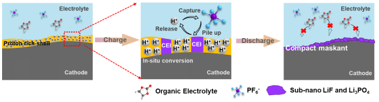 隨著人們對(duì)于新能源汽車?yán)锍桃蟛粩嘣黾樱哝嚾獑尉д龢O材料(LiNixCoyMn1-x-yO2, x>0.9)因其較高的能量密度(4.3V,210 mAh g-1)成為了下一代高能量密度鋰離子動(dòng)力電池正極主要的主要候選者。然而,其單晶材料表界面離子傳輸慢與副反應(yīng)嚴(yán)重等問題成為制約超高鎳單晶正極長(zhǎng)循環(huán)穩(wěn)定性的關(guān)鍵因素,亟需優(yōu)化界面。質(zhì)子因其與電解液溶質(zhì)LiPF6的高反應(yīng)活性,一直被認(rèn)為是界面副反應(yīng)的標(biāo)志。而其副反應(yīng)產(chǎn)物L(fēng)iF和Li3PO4卻是理想的界面鈍化保護(hù)層可以抑制副反應(yīng)。因此,合理設(shè)計(jì)并利用質(zhì)子有望改善正極材料的循環(huán)壽命。