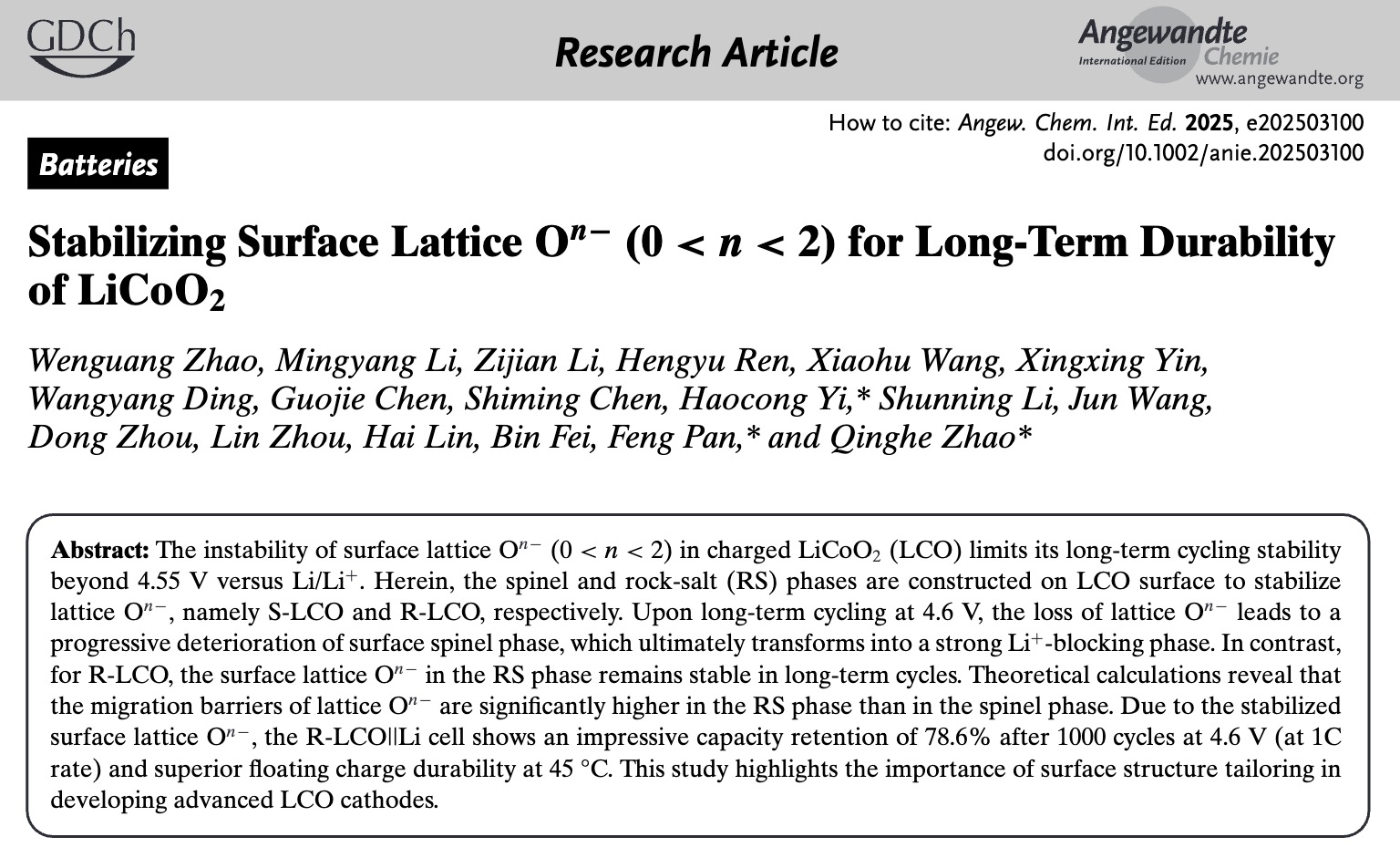 近日,北京大學(xué)深圳研究生院新材料學(xué)院潘鋒/趙慶賀團隊取得重要研究進展,通過調(diào)控表面Li+含量,在LCO表面構(gòu)建尖晶石相(S-LCO)和巖鹽相(R-LCO),結(jié)合循環(huán)后表面相表征、價態(tài)分析與氧空位形成/遷移的理論計算,闡明了兩種表面相對晶格On-穩(wěn)定性的差異。研究發(fā)現(xiàn),在4.6 V下長期循環(huán)過程中,LCO表面的尖晶石相因晶格氧損失逐漸退化,最終轉(zhuǎn)變?yōu)檩^厚的Li?阻擋相結(jié)構(gòu);而R-LCO表面巖鹽相中的晶格氧在循環(huán)中保持長效穩(wěn)定,保障了表面Li+的穩(wěn)定脫嵌。理論計算表明,巖鹽相中晶格氧的遷移勢壘顯著高于尖晶石相。得益于表面晶格氧的穩(wěn)定化,R-LCO||Li電池在4.6 V電壓下以1 C電流循環(huán)1000次后容量保持率高達78.6%,并在45℃浮充測試中表現(xiàn)出優(yōu)異的耐久性。該研究揭示了表面結(jié)構(gòu)調(diào)控對提升LCO正極性能的重要性,為開發(fā)先進高壓LCO正極提供了新思路。相關(guān)研究成果以“Stabilizing Surface Lattice On- (0<n<2) for Long-Term Durability of LiCoO2”為題,發(fā)表于國際頂級期刊《德國應(yīng)用化學(xué)》(Angewandte Chemie International Edition,影響因子16.8)。