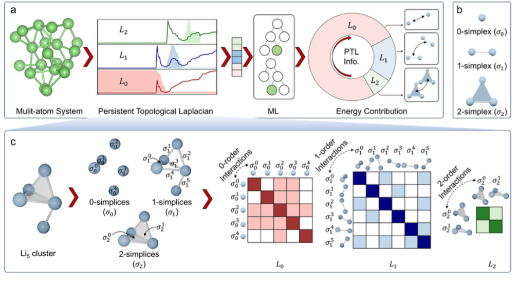 研究創(chuàng)新性地將復雜的原子結構映射為拓撲空間中的單純復形(simplicial complex),運用PTL方法進行多尺度分析,生成表征多體相互作用的“拓撲指紋”。其技術路線如圖1所示:首先將多原子系統(tǒng)(如鋰原子簇)視為一個單純復形——0維單形對應原子,1維單形代表原子連接,2維單形描述三原子環(huán)狀結構;隨后通過原子間距參數(shù)d的“過濾(filtration)”過程,系統(tǒng)捕捉不同尺度結構特征。在每個尺度下,PTL方法計算0維、1維和2維的拓撲拉普拉斯算子(L1,L2,L3),其譜信息構成系統(tǒng)拓撲與幾何特性的多維描述。該方法突破傳統(tǒng)原子坐標描述符的局限,系統(tǒng)性編碼原子間“多體相互作用”的復雜信息,為理解和預測材料性質提供全新的物理視角。