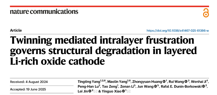 近日,新材料學(xué)院肖蔭果團(tuán)隊(duì)聯(lián)合德國(guó)于利希研究中心在國(guó)際知名期刊《Nature Communications》上發(fā)表了題為“Twinning mediated intralayer frustration governs structural degradation in layered Li-rich oxide cathode”的研究論文。該工作創(chuàng)新性地采用原位工況中子衍射與掃描透射電子顯微鏡多尺度關(guān)聯(lián)分析方法,揭示了石墨||LRM 軟包全電池工況下LRM氧化物的微觀結(jié)構(gòu)退化機(jī)制。該組合手段不僅實(shí)現(xiàn)了實(shí)時(shí)相分?jǐn)?shù)/特征結(jié)構(gòu)參數(shù)解析,還能在大視場(chǎng)范圍內(nèi)進(jìn)行取向、缺陷與應(yīng)變分布映射。研究發(fā)現(xiàn),初始LRM顆粒呈現(xiàn)部分有序的類Li2MnO3固溶體相,并存在多種取向結(jié)構(gòu)疇與平面缺陷。隨循環(huán)進(jìn)行,在不可逆Li+層間遷移與過渡金屬層內(nèi)重排驅(qū)動(dòng)下,材料逐漸從有序單斜相逐步轉(zhuǎn)變?yōu)闊o(wú)序菱方相。尤其是在首次完全充電后,形成了層間類孿晶結(jié)構(gòu)和局部層內(nèi)阻挫。隨著循環(huán)次數(shù)增加,層內(nèi)阻挫進(jìn)一步演變?yōu)轭w粒內(nèi)部沿{012}孿晶界的顆粒內(nèi)部孔洞微結(jié)構(gòu),最終破壞層狀框架并阻礙Li+擴(kuò)散。與傳統(tǒng)理論將容量/電壓衰減歸因于宏觀相變不同,本研究首次揭示“孿晶介導(dǎo)的層內(nèi)挫折向孔洞化缺陷演進(jìn)”是富鋰正極性能衰退的決定性因素。