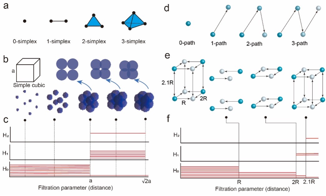 該研究基于代數(shù)拓?fù)淅碚摚瑢⒉牧系脑咏Y(jié)構(gòu)抽象為數(shù)學(xué)復(fù)形(simplicial or path complexes),并通過計算其拓?fù)洳蛔兞浚ㄈ?span lang="EN-US">Betti數(shù)、循環(huán)密度等),實現(xiàn)對結(jié)構(gòu)形貌、連通性與孔洞特征的多尺度量化。相較于傳統(tǒng)經(jīng)驗型結(jié)構(gòu)描述符(如配位數(shù)、局部環(huán)境參數(shù))或“黑箱式”深度學(xué)習(xí)特征,該方法具備更強的結(jié)構(gòu)敏感性與物理可解釋性,能夠有效捕獲材料體系中與性能相關(guān)的高維幾何與連通信息。