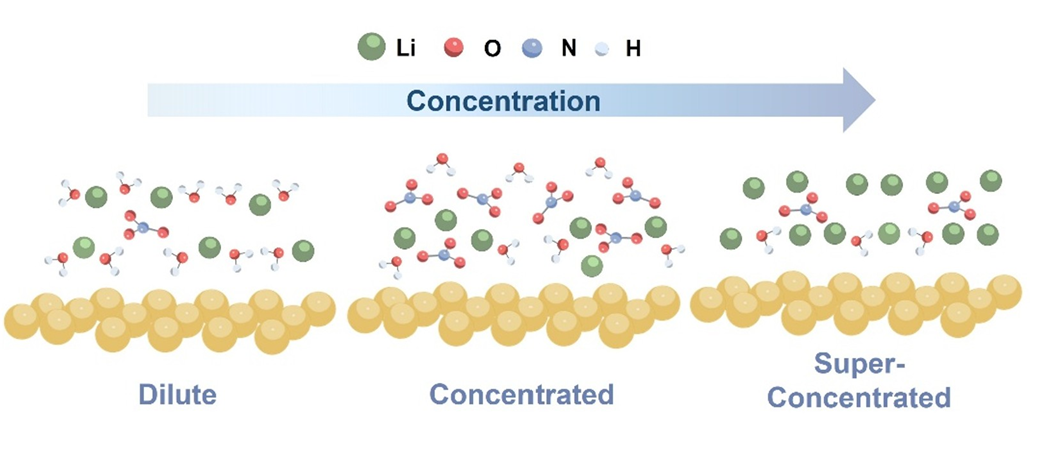 為深入解析界面微觀結(jié)構,研究團隊結(jié)合分子動力學模擬(MD)與從頭算分子動力學(AIMD)方法,構建了電極/電解液界面的原子模型。在最佳濃度與工作電位下,界面區(qū)域呈現(xiàn)出獨特的雙層有序結(jié)構:下層為有序的3Li?·NO??平面,其中Li?的配位作用削弱了N-O鍵,降低反應活化能;上層為垂直取向的NO??,通過與水分子形成氫鍵顯著提升了H?O?=?比例。如圖2所示,濃度效應進一步驗證了該機制的普適性。值得注意的是,該機制在稀釋或過高濃電解液中均無法有效形成:前者因離子數(shù)目不足,后者因Li?水化鏈鎖定水分子網(wǎng)絡。