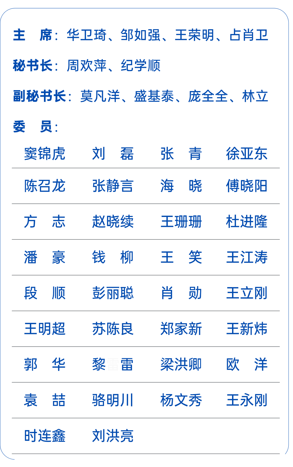 執(zhí)行主席:華衛(wèi)琦、鄒如強(qiáng)、王榮明、占肖衛(wèi)
