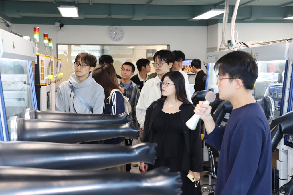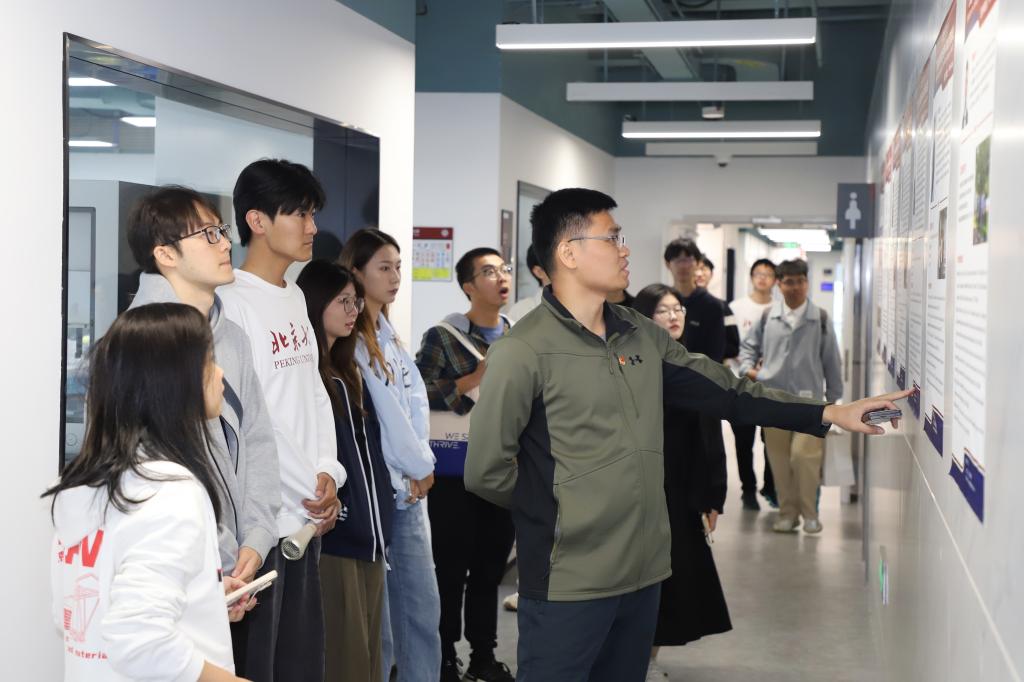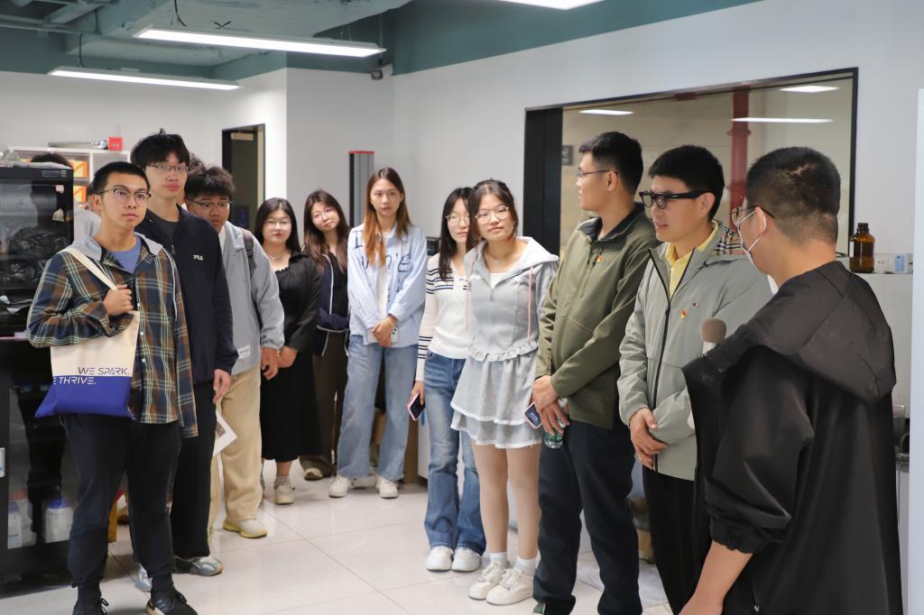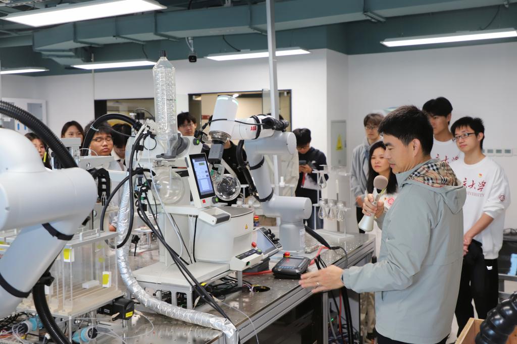 活動(dòng)伊始,在新材料學(xué)院教工黨支部書(shū)記莫凡洋的帶領(lǐng)下,中山大學(xué)師生代表及本院碩士生黨員代表參觀了位于南山智園的實(shí)驗(yàn)室。在“AI+烯碳實(shí)驗(yàn)室”,師生們實(shí)地觀摩了集成了語(yǔ)言模型、自動(dòng)化實(shí)驗(yàn)裝備與機(jī)器學(xué)習(xí)模型的納米碳材料智能合成平臺(tái)。隨后,在“材料檢測(cè)及電池測(cè)試室”,通過(guò)參觀覆蓋電池研發(fā)全流程的一體化制備與測(cè)試裝置,大家深切體會(huì)到了高端實(shí)驗(yàn)平臺(tái)的技術(shù)實(shí)力與應(yīng)用前景。在 “AI合成化學(xué)實(shí)驗(yàn)室”,莫凡洋老師詳細(xì)講解了自動(dòng)化機(jī)器人平臺(tái)的工作流程與效率優(yōu)勢(shì),其生動(dòng)的介紹激發(fā)了同學(xué)們對(duì)智能化科研的濃厚興趣。參觀活動(dòng)使師生們直觀領(lǐng)略了科研范式智能化變革的魅力,拓寬了學(xué)術(shù)視野,增強(qiáng)了投身材料科學(xué)前沿探索的動(dòng)力。