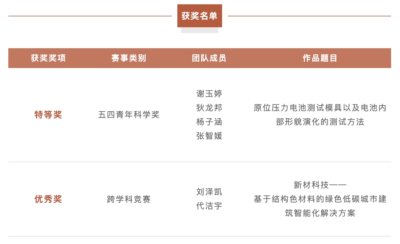 在本屆賽事中,新材料學(xué)院共兩支隊(duì)伍參賽并斬獲佳績(jī),榮獲五四青年科學(xué)獎(jiǎng)特等獎(jiǎng)1項(xiàng)、跨學(xué)科競(jìng)賽優(yōu)秀獎(jiǎng)1項(xiàng)。特此向獲獎(jiǎng)團(tuán)隊(duì)及指導(dǎo)老師表示祝賀!