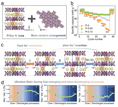 近日,新材料學(xué)院肖蔭果課題組在國際綜合期刊《Advanced Science》上發(fā)表題為“Layered Cathode with Ultralow Strain Empowers Rapid-charging and Slow-Discharging Capability in Sodium Ion Battery”的文章,不同于常規(guī)倍率測(cè)試中的快充快放模式,該文章聚焦于更適配實(shí)際應(yīng)用的快充慢放這一不對(duì)稱電化學(xué)測(cè)試模式,這不僅要求極高的倍率性能以滿足不對(duì)稱倍率下的對(duì)稱鈉離子嵌脫量,并且要求正極材料具有極低的結(jié)構(gòu)應(yīng)變以適...